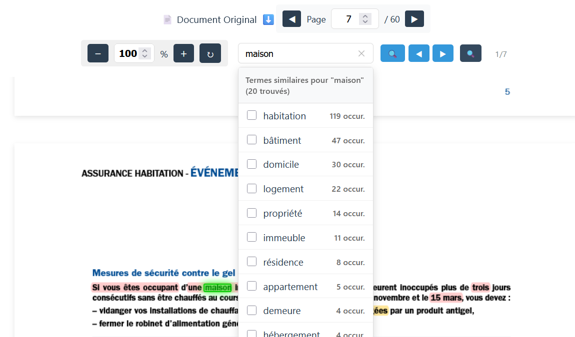 Trouvez instantanément toutes les variations d'un terme dans vos documents. Notre algorithme détecte automatiquement les synonymes et expressions équivalentes.